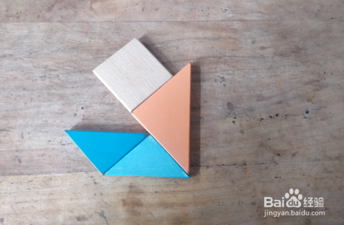 摆上蓝色三角形,放在蓝色三角形的左侧挨着,直角向下,如图。