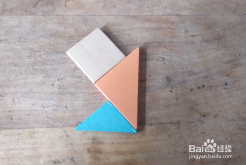 摆上蓝色三角形,放在三角形的下面挨着,下端一齐,如图。