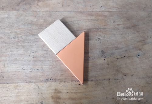 摆上黄色三角形,放在橙色三角形的右侧挨着,下端一齐,如图。
