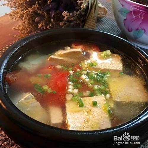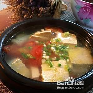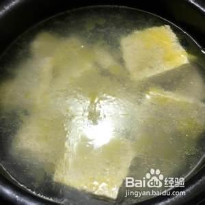 掺入高汤(如果没有就用清水+浓汤宝,浓汤宝也没有就直接清水+鸡精好啦)烧开,调盐(汤在熬制中会略有减少,注意用量),转小火熬至豆腐入味;
