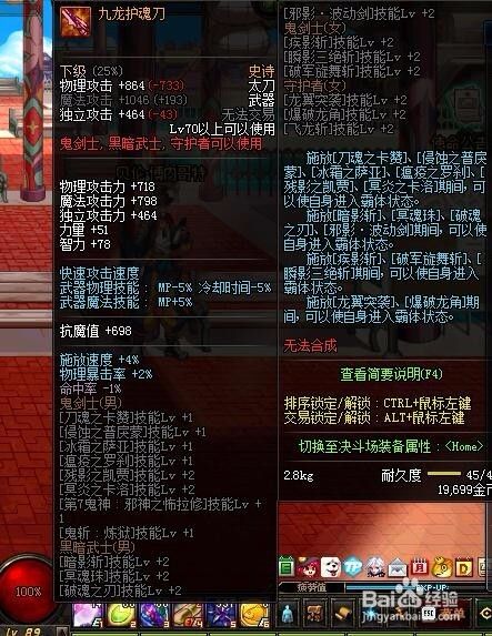 我们将九龙护魂刀拾取后,可以在背包中查看,可以看到各项属性都非常的不错,如图所示。