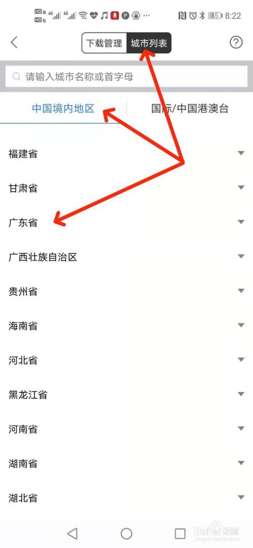 选择“城市列表",然后去选择目的地。如我选择“中国境内地区”、“广东省”。