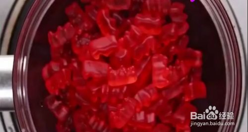 如何制作好吃的布丁呢?首先将小熊软糖放入锅中融化,融化成液体之后,放入倾斜的杯子中