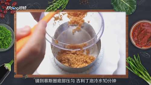 2铺到慕斯圈底部压匀,吉利丁泡冷水10分钟。