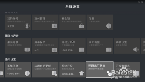 若方法一方法二仍不能缓解空间不足问题无法安装软件,那么可能是系统出了问题,需要还原恢复出厂设置。在盒子的系统设置中,就可以找到还原出厂设置选项