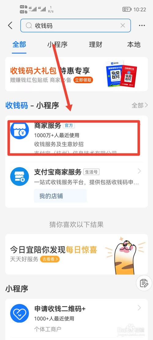 打开支付宝在搜索框内搜索收钱码,选择商家服务,点击右上角设置,选择我的收钱码,点击查看附近的打印店,打印完成后,贴在商铺内,即可完成商家收款码的推广。