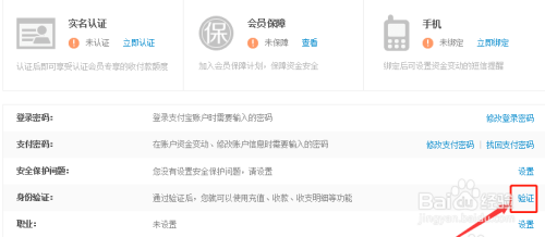 之后登入我们需要关联的的子账号,点击账户设置,找到验证然后点击。之后填写自己的省份证信息,以及支付密码,填完之后点击验证选项。