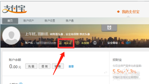 首先需要我们注册一个未实名支付宝账号,然后登入支付宝,到这个页面上面,下图是没有实名的支付宝,然后我们去实名,点击未认证去实名认证可以了。