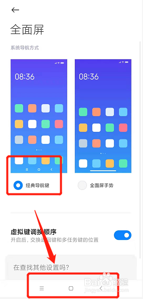 在全面屏页面,切换到经典导航键,即可显示下面三个虚拟键。