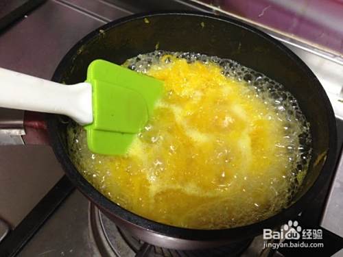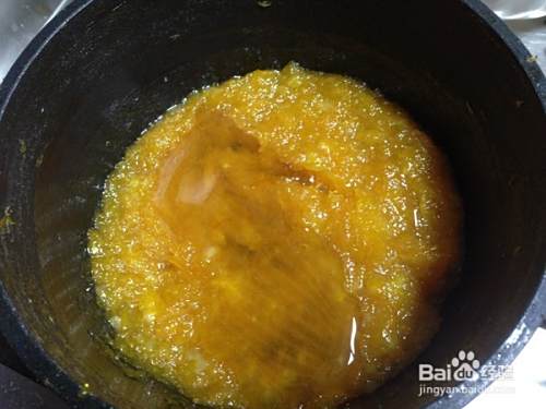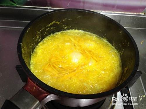 将腌制好的橙肉和橙皮混合倒进不沾锅慢火加热,用勺子轻轻将果肉剥离开来