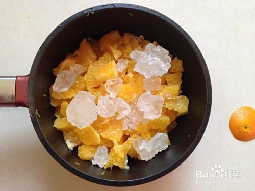 橙肉放入容器中加入冰糖拌匀腌制2小时,冰糖的糖粉可以使橙肉出水这样可以减少熬制的时间