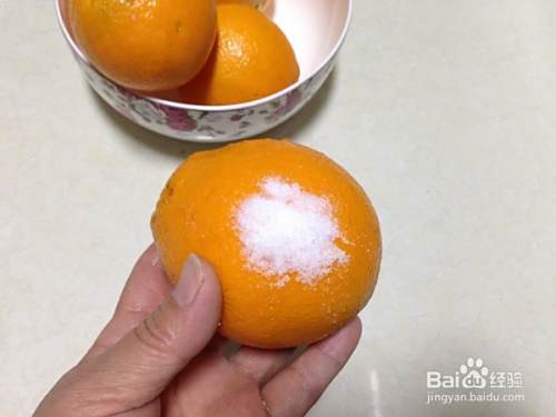 先把橙子洗净,用盐搓洗表面重复3-4次,去除橙子表面的果蜡