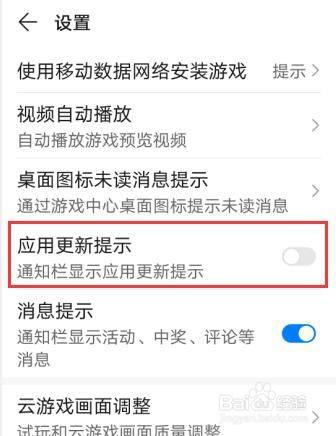 点击【应用更新提示】后面按钮即可开启通知栏显示应用更新提示。