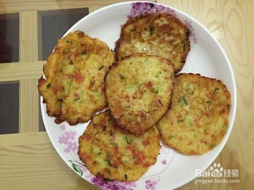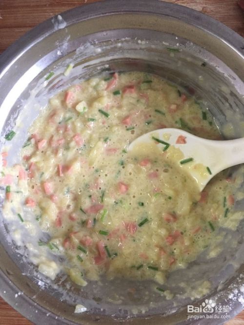 给土豆泥里面打鸡蛋,然后放入切好的葱和火腿,再加入少许盐搅拌。最后加入少许面粉。