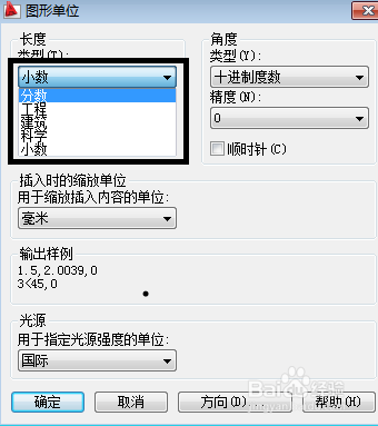 此时页面会弹出一个图形单位的设置页面,在此设置页面里我们首先点击长度类型选择按钮,在弹出的下拉菜单页面里我们点击选择小数按钮。