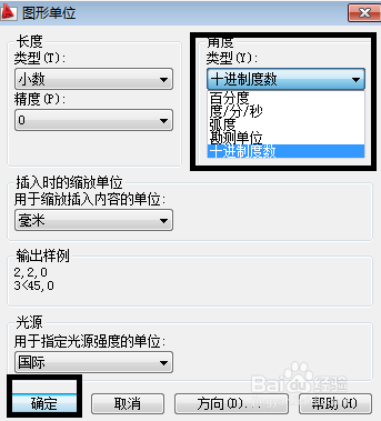 设置完精度以后,我们再继续点击选择角度类型,此时会弹出一个角度的下拉菜单,在此下拉菜单页面里我们点击选择角度的类型为十进制度数。角度设置完毕后,软件的单位就算全部设置完毕了,我们点击下方的确定按钮即可对设置进行保存