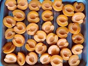 将清洗干净的杏,用刀对半切开取出核,在切成小块