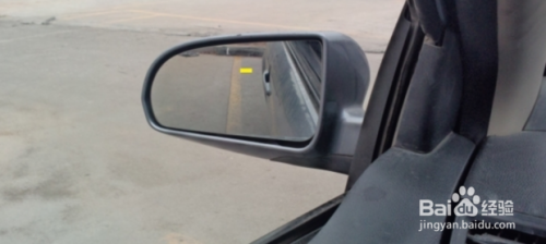 从后视镜观察车身与库平行或左窗边框与外面黄色线平行时,方向盘回正:
