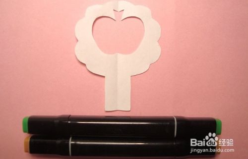 然后,把苹果树的图形的剪纸展平,摆放在桌子上,并选择浅绿色和浅棕色的马克笔,准备涂上颜色,如下图所示。