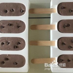 然后倒入模具,如果很稠就适量再加一点牛奶搅匀,不要加太多。撒上巧克力豆(可不放)然后放入冰箱冷冻成型