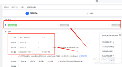 点击左边营销中心的店铺营销工具。点击创建店铺优惠券。选择推广渠道,设置优惠券信息即可。