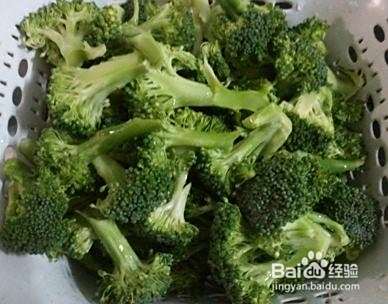 取新鲜的西兰花一棵,去掉根部后切好洗净,放置一边沥水备用。