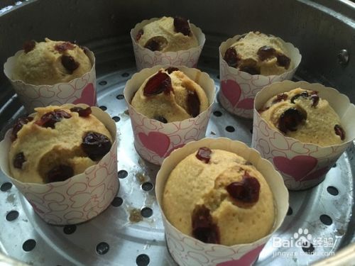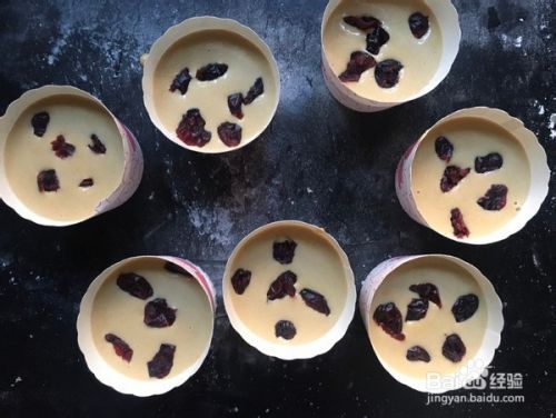 6将米糊均匀的倒入模具里,大约倒入7、8分满即可,预留出发酵的空间,再在上面撒点蔓越莓干;如果没有模具,纸质较厚的蛋糕纸杯也可以;
