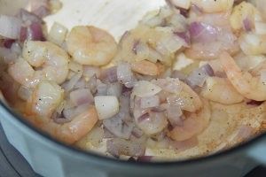 加入洋葱、虾仁快速翻炒,炒出香味,加入盐调味披缝将虾仁盛出来,洋葱留在锅内