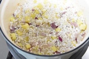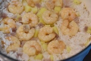 准备好材料捧八宙,大米淘洗干净,提前用水浸泡30分钟土豆削皮切成小块,洋葱切成碎,虾仁在后背开个口挑出虾线