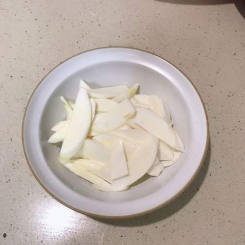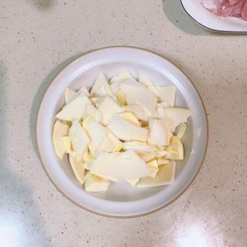 现在的春笋比较大个,我买的这个用了四分之一,先从中间切成两半,再切两半,然后取四分之一切成薄片。