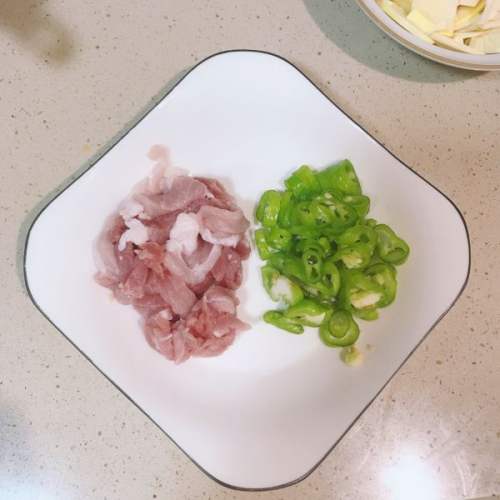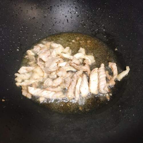 4热锅加油,然后放肉丝煸炒至发白,可以炒干一点会比较香。