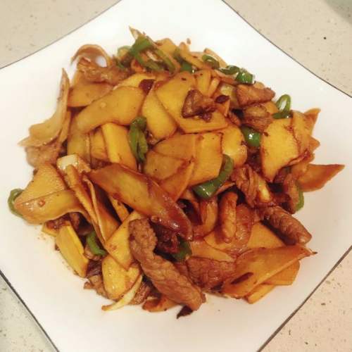 8然后沿着锅边加入一点料酒,然后放入两汤匙味极鲜生抽。放一点点五香粉,再翻炒均匀!大概一分钟。如果觉得锅干了可以加一点点水,一点点哦!不要多了!