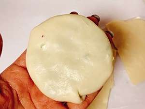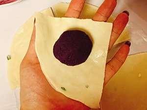 手抓饼解冻后用刀划成四份,拿一片手抓饼放入紫薯球
