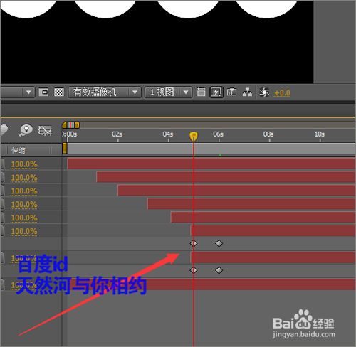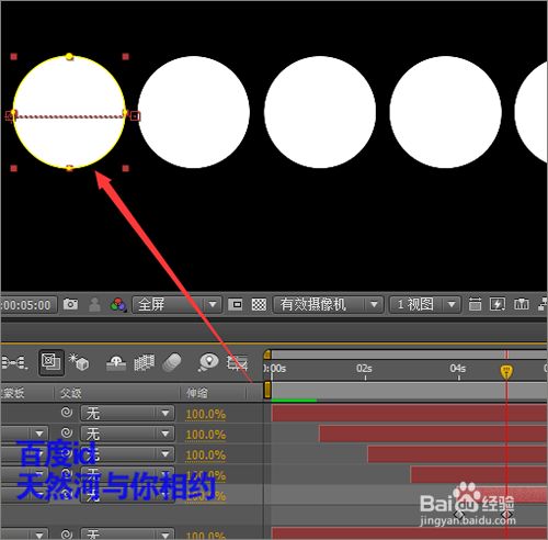 复制圆形1,把它命名为圆形5。其它的操作都是一样的,把它的图层向后面移动,然后删除它前面的关键帧。把后面的关键帧向前面移动。把时间线的位置移动到5秒的位置。然后把它的关键帧位置同样向前拉一些。把它x轴上面的数值向前调整到110。