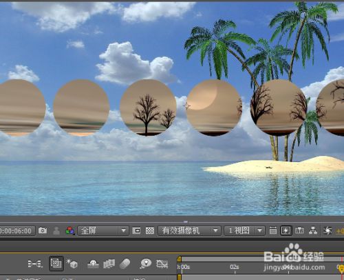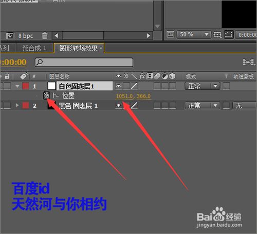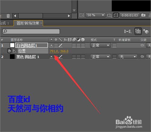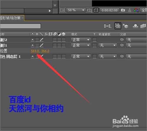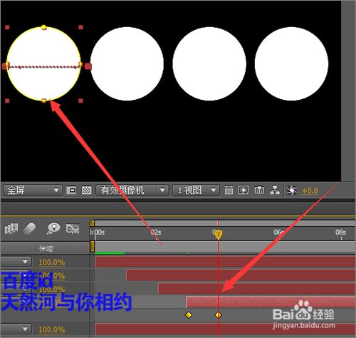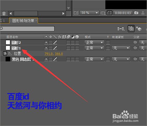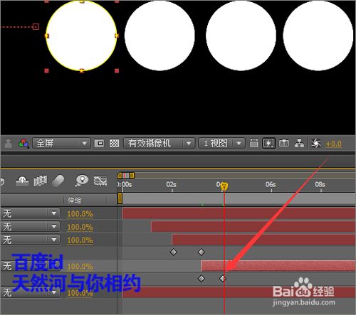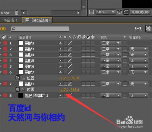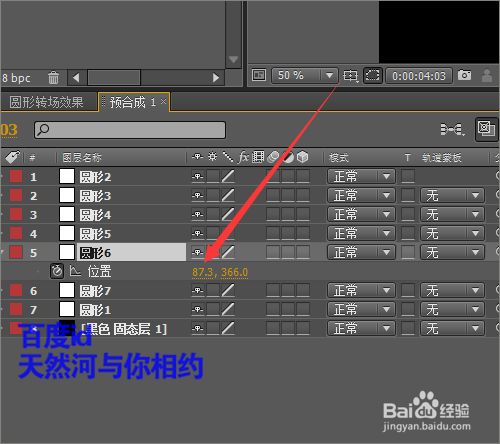 复制圆形1,把它命名为圆形7。在这一步的操作中和其它的图层中的圆形操作不一样。复制的圆形7和圆形1的位置属性在这里不用作其它的更改。暂时的保留它们相同的位置关键帧。这里先介绍它转场需要的圆形效果的制作,下一经验中将介绍如果进行转场的应用。
