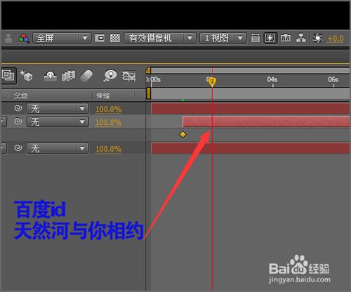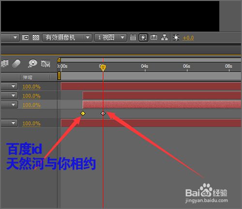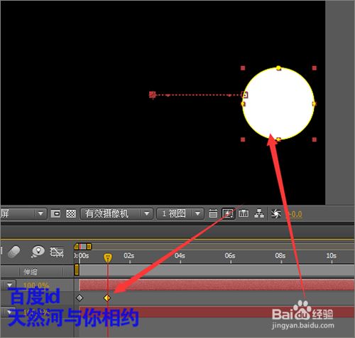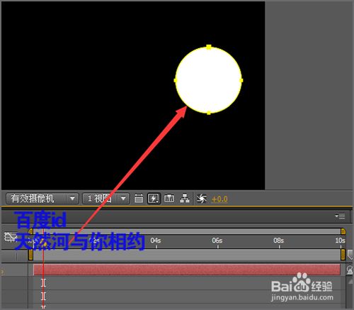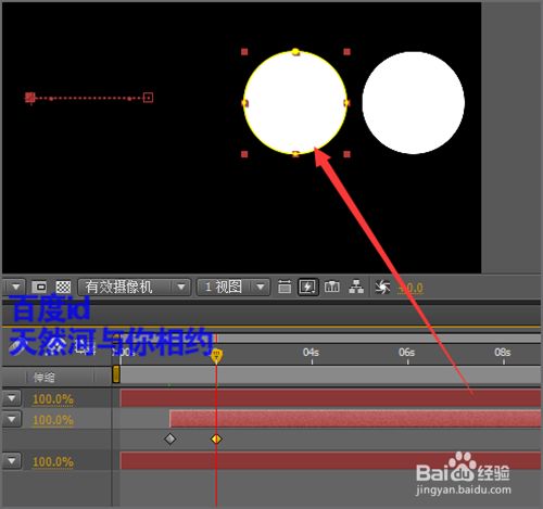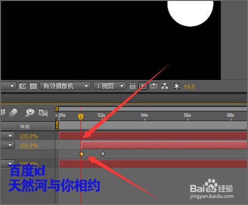 然后选择圆形1的图层,把它向后面移动一秒。点击键盘上的u键,调出它的关键帧。选择第一个关键帧并把它删除。并把后面的一个关键帧向前移动到1秒的位置。