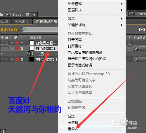移动好它的位置之后,把这个白色的层按着键盘上的ctr+d复制一份。然后把下面的一个点击右键把它重新的命名一下。把它命名为圆形1。接着再把上面的那一个命名为圆形2。