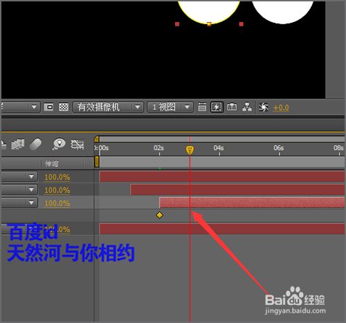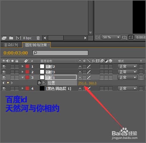 接着再把圆形1复制一份。把它命名为圆形3。选中图层1。这里的操作和上面的操作是一样的。把它的图层向后面移动一秒。并把它前面的关键帧删除。把后面的关键帧移到2秒的位置。并在3秒的位置添加一个关键帧。