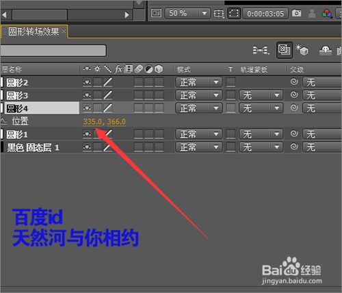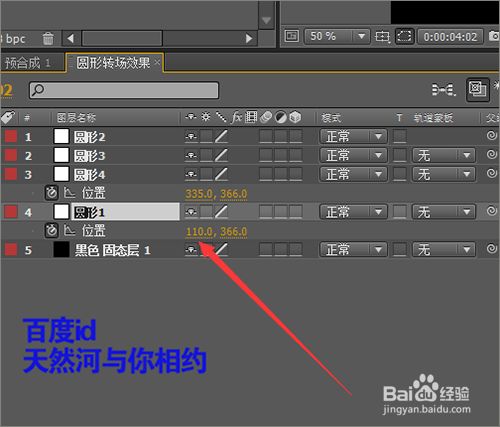 然后接下来同样要复制圆形1,把它命名为圆形4。其它的操作都是一样的,把它的图层向后面移动,然后删除它前面的关键帧。把后面的关键帧向前面移动。把时间线的位置移动到4秒的位置。然后把它的关键帧位置同样向前拉一些。把它x轴上面的数值向前调整到110。