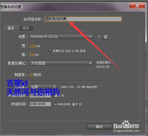 打开软件,在菜单中新建合成组中新建一个合成。这里就新建一个大小为1280*720的大小。把它命名为圆形转场效果。帧速率为25帧。它的时间为10秒。然后点击确定。
