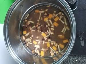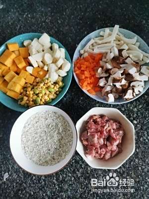 牛肉、南瓜、胡萝卜、香菇、山药切丁,自己喜欢吃的都可以切丁放进去替代不喜欢吃的,家里还有玉米粒和青豆粒我就一块放进去啦!