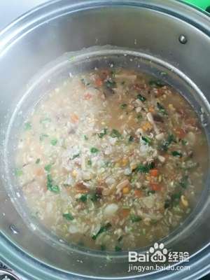 淘洗好的大米糯米同炒好的菜一块放进汤锅,加水,平时煮粥的水量就行。大火煮开,中火继续煮半小时,喜欢吃青菜的中间可以把洗好的青菜段放入。用电饭煲也可以,按煮粥键即可。