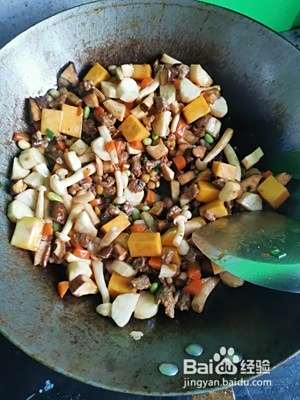 下其他食材一起翻炒,放少量盐,耗油继续炒两三分钟,不用炒熟,断生即可,等会儿还要炖。