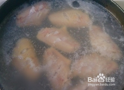 锅里加入适量水,滴入加入适量料酒烧开,下入鸡翅焯水,再次烧开煮一分钟捞起沥干水分