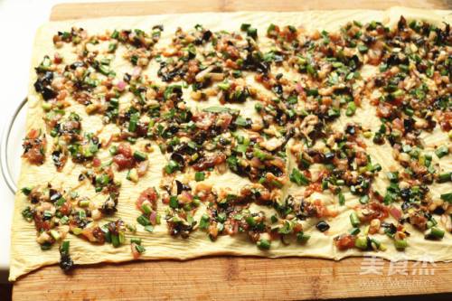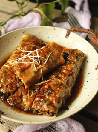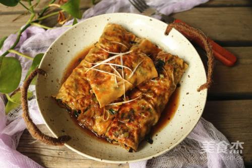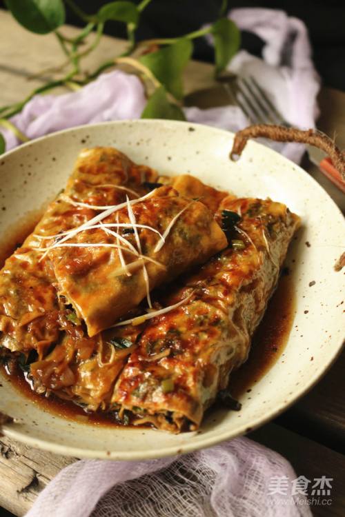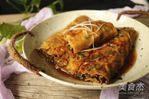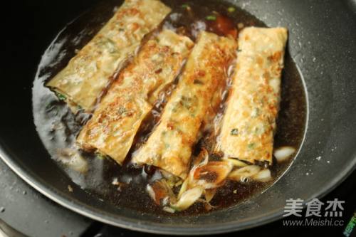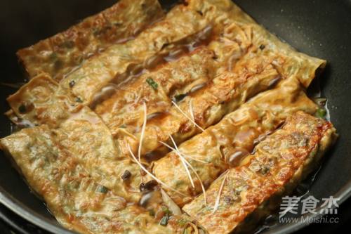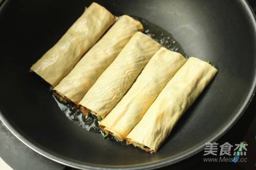 10炒锅放油,下入豆皮肉卷开始煎制。
