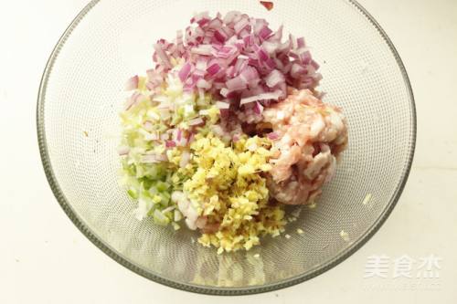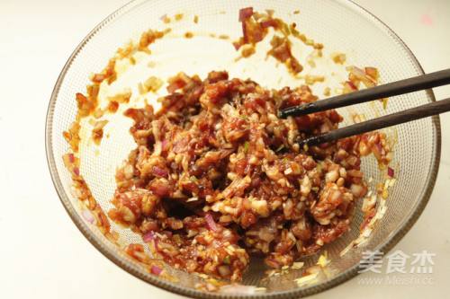 3肉馅加入切碎的姜末,葱末,洋葱末。