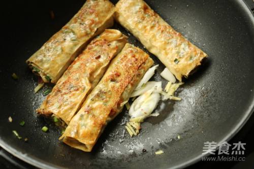 11煎至两面金黄,推到一边,下入一些葱丝炒香。