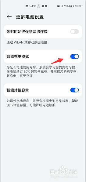 目前“智能充电模式”是开启状态,在电量超过80%时暂停充电。
