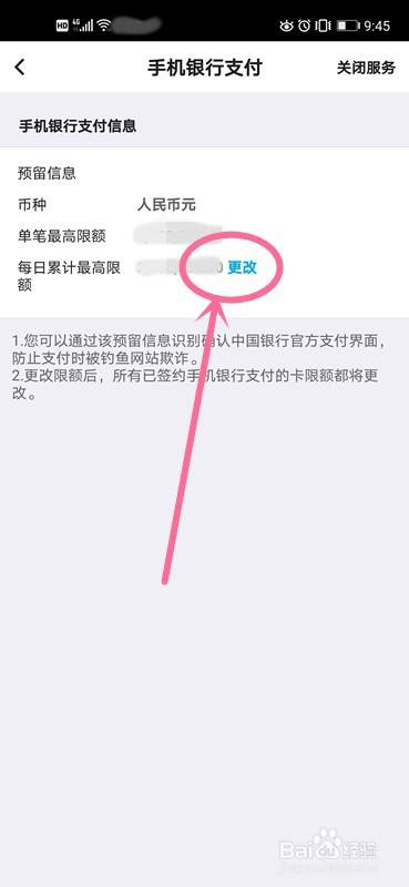 最后在手机银行支付界面,点击页面上的“更改”,即可对转账限额进行设置。