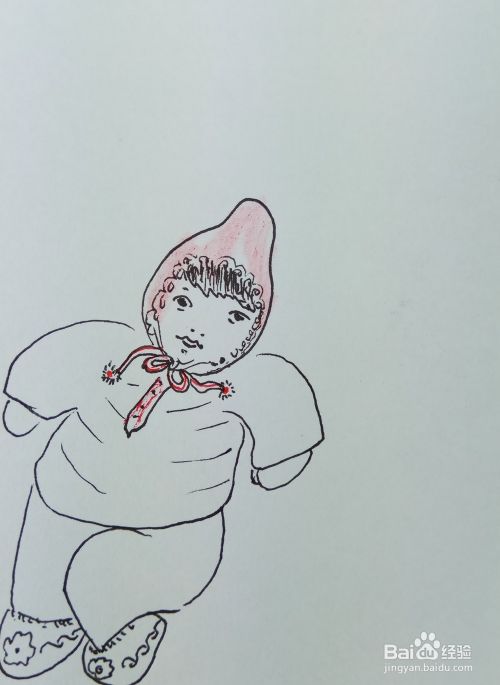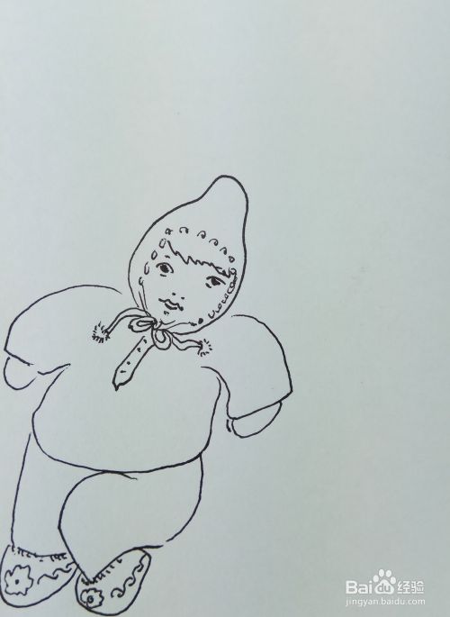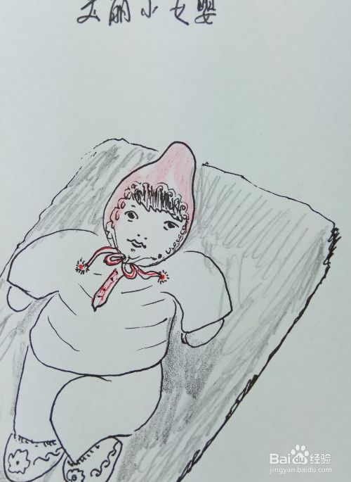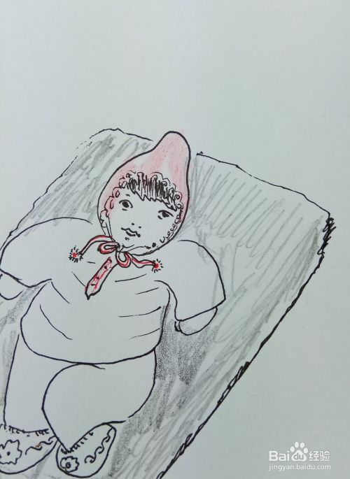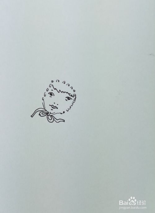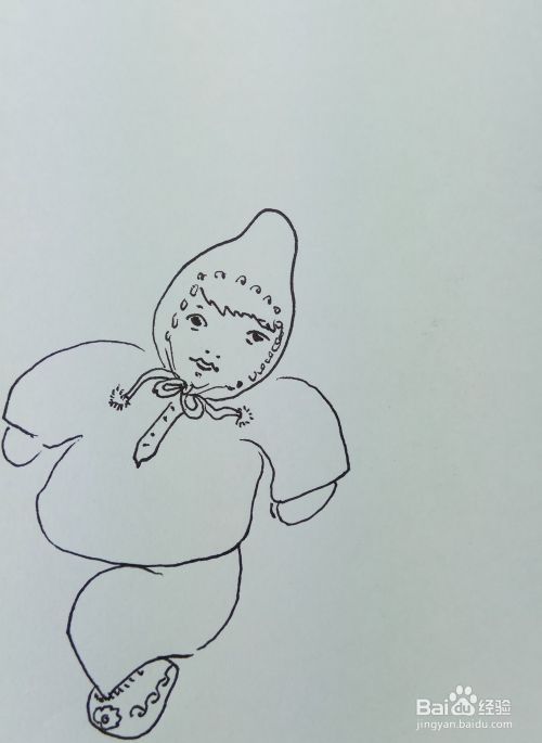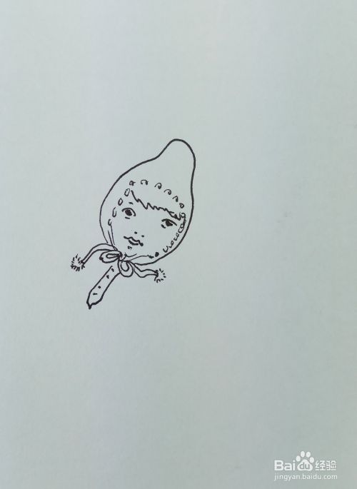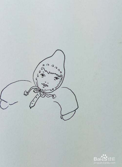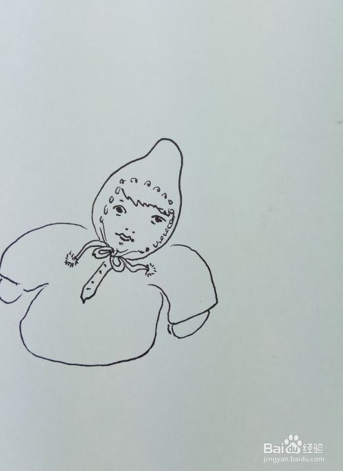 在白纸上用线条和曲线画出小女婴的头部轮廓,画出她的五官和头上戴着的帽子。